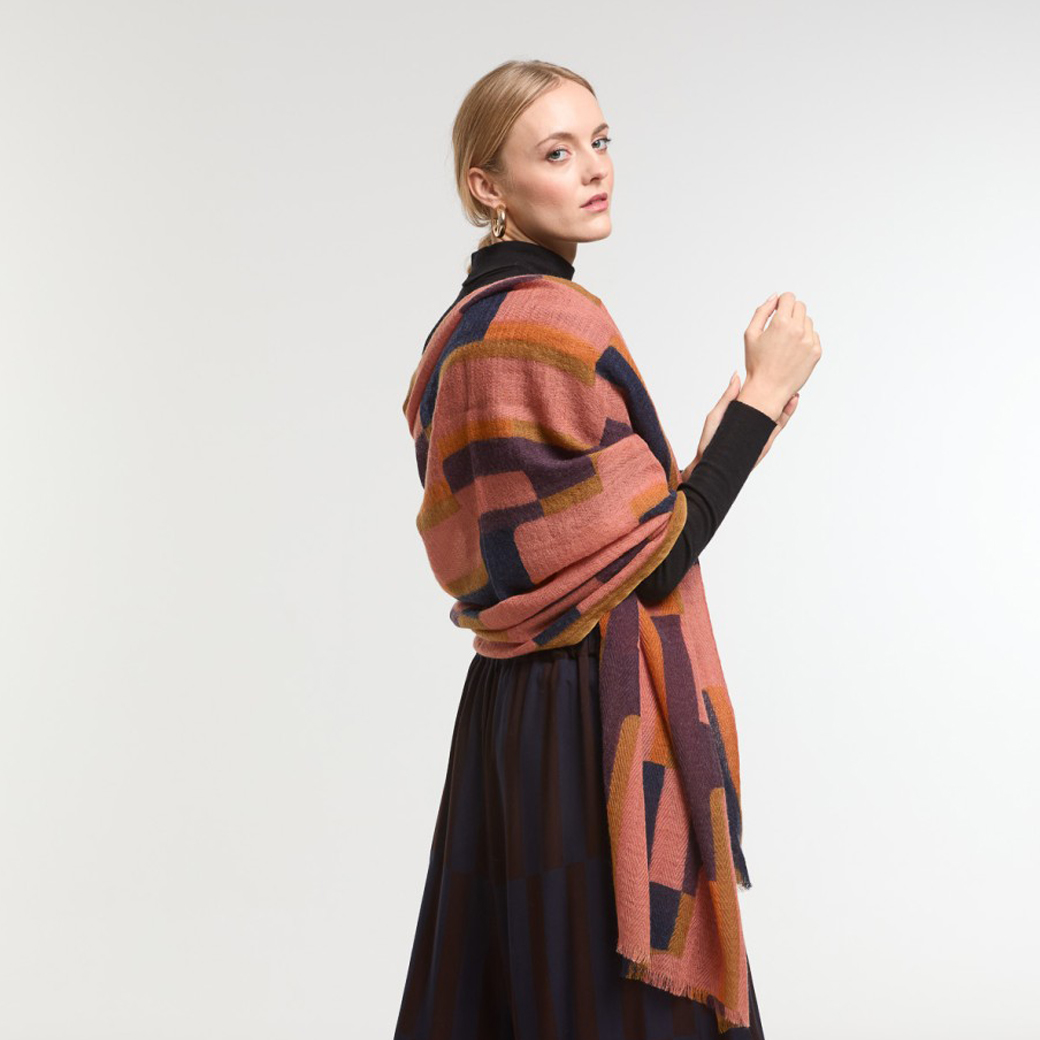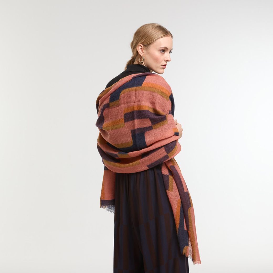 El foulard Edom cautiva con su lana esponjosa, suave y generosamente envolvente. Inspirándose en las prendas prêt-à-porter de la temporada, presenta un patrón gráfico de formas entrelazadas que combina líneas tensas y curvas suaves en una composición equilibrada. Una pieza cómoda y expresiva, diseñada para ampliar el universo visual de la colección y complementar con delicadeza tus looks.
