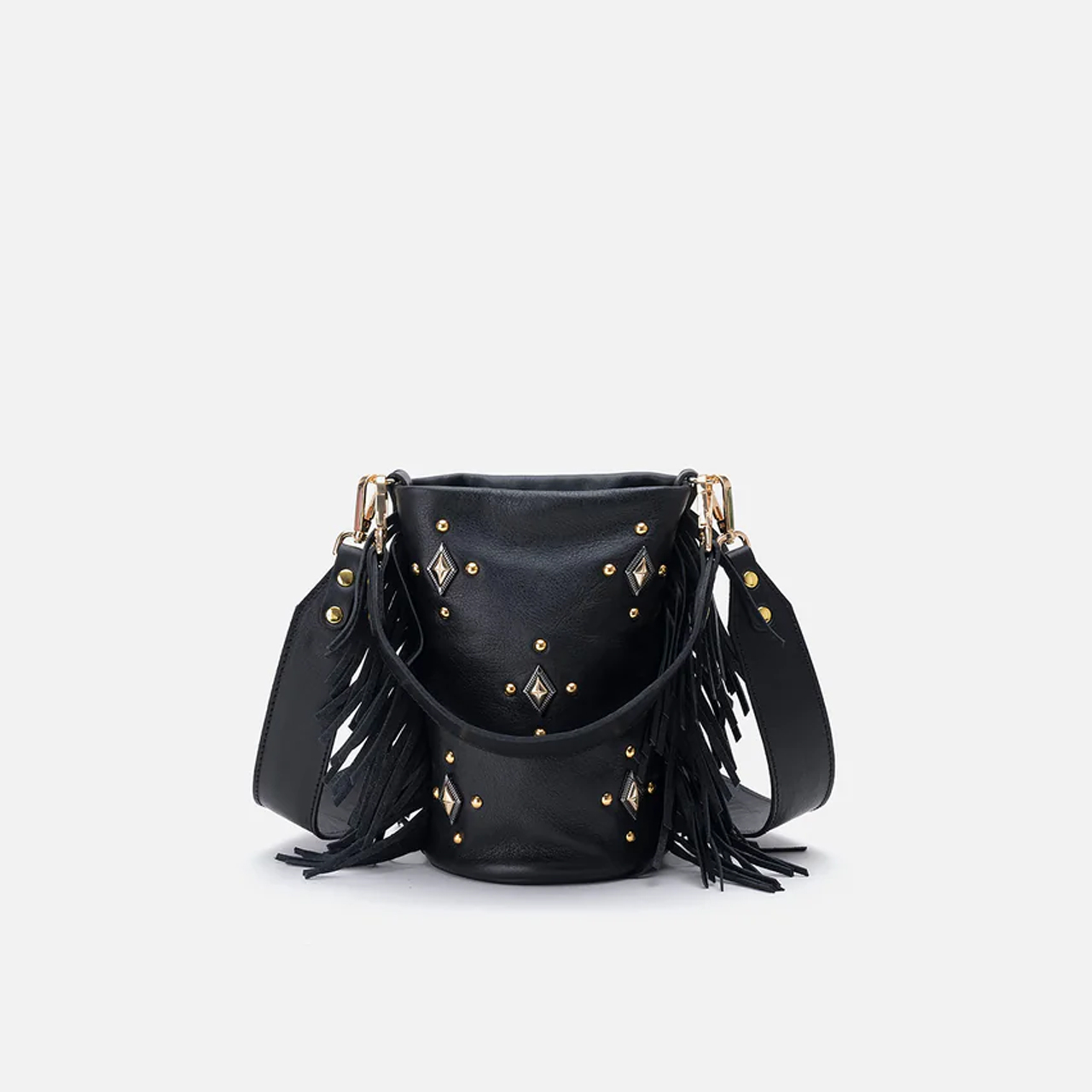 Bolso pequeño de piel con flecos en los laterales, tachuelas decorativas en el frente y doble asa ancha. Es un bolso ligero y muy versátil, perfecto para el día o la noche.
