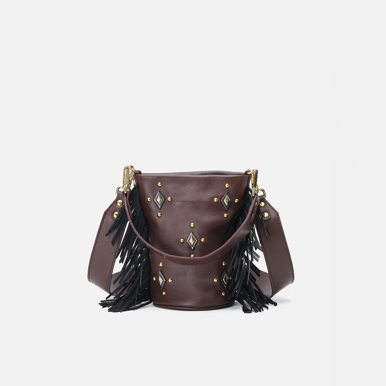 Bolso pequeño de piel con flecos en los laterales, tachuelas decorativas en el frente y doble asa ancha. Es un bolso ligero y muy versátil, perfecto para el día o la noche.