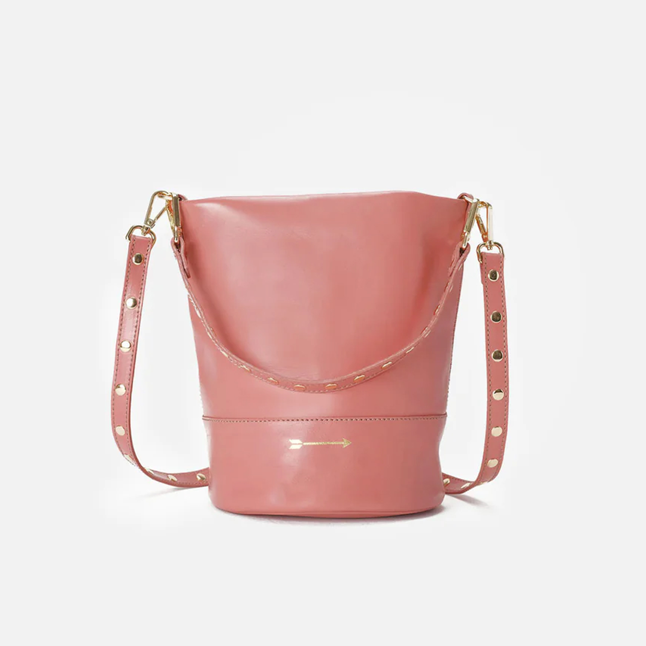Bolso cubo mediano de piel con dos asas desmontables con remaches: una corta para llevarlo al hombro o en la mano y otra larga para llevarlo como bandolera. Tiene una gran capacidad interior, y sus asas con remaches dorados elevarán cualquiera de tus looks.