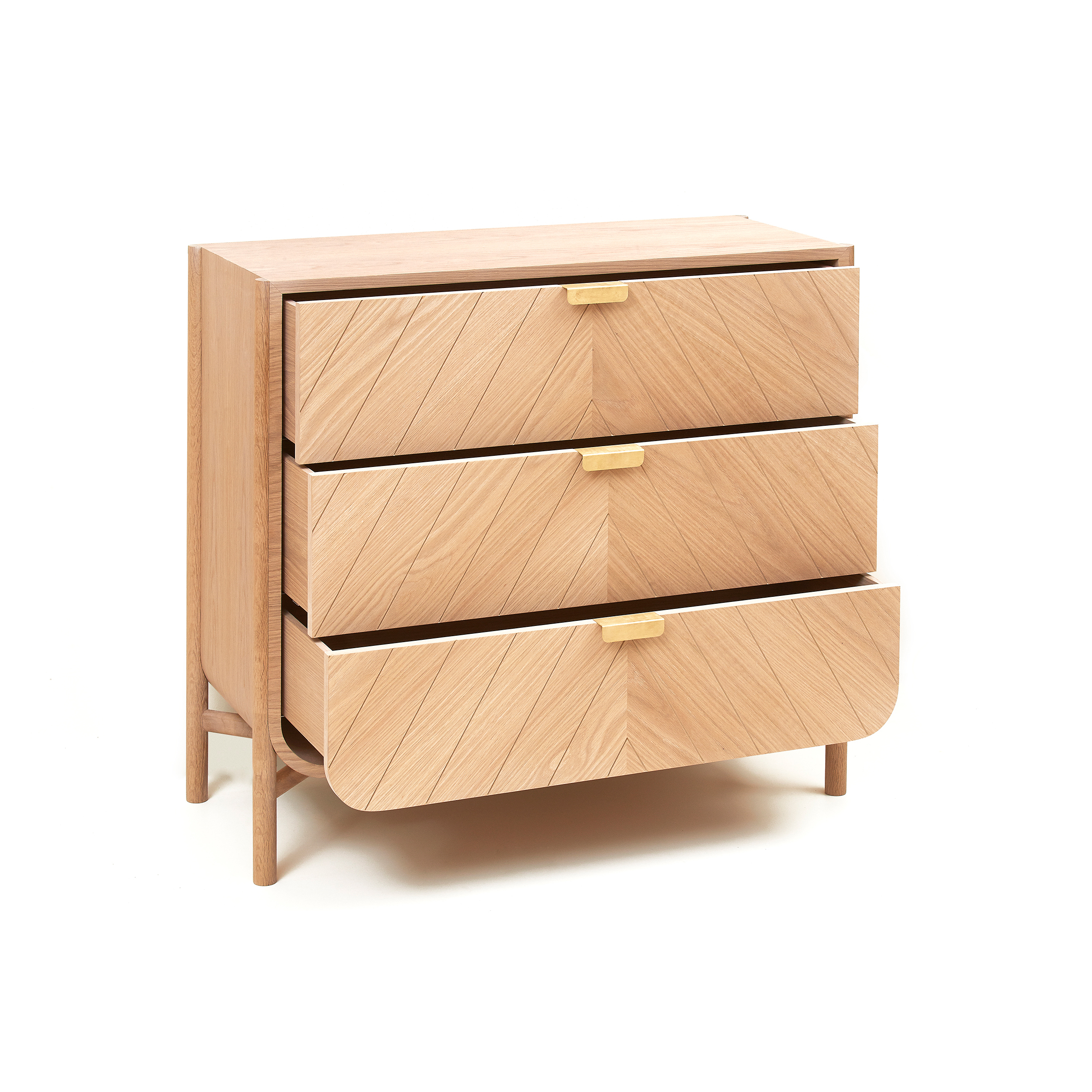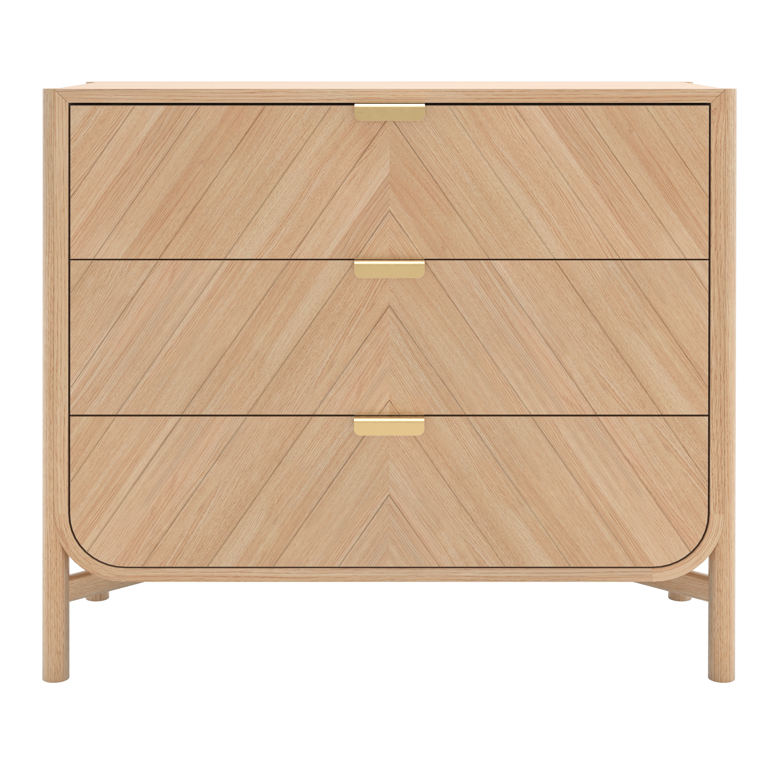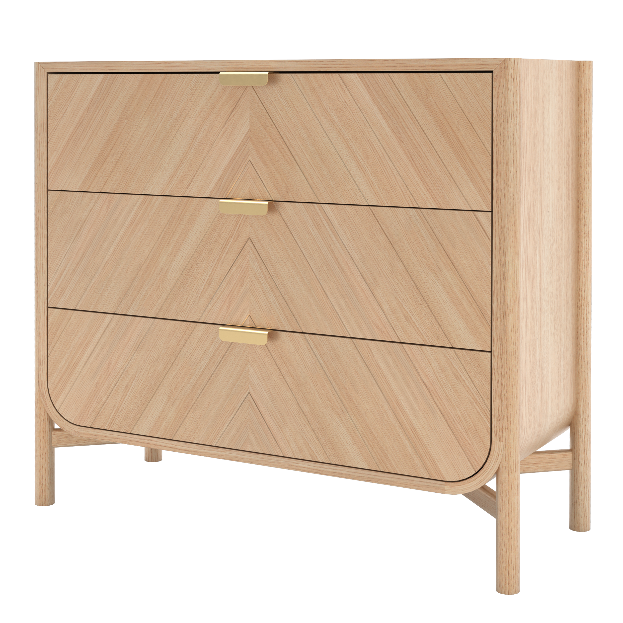 Cómoda de tres cajones Marius de roble natural, con frentes grabados en chevron y tiradores de latón.