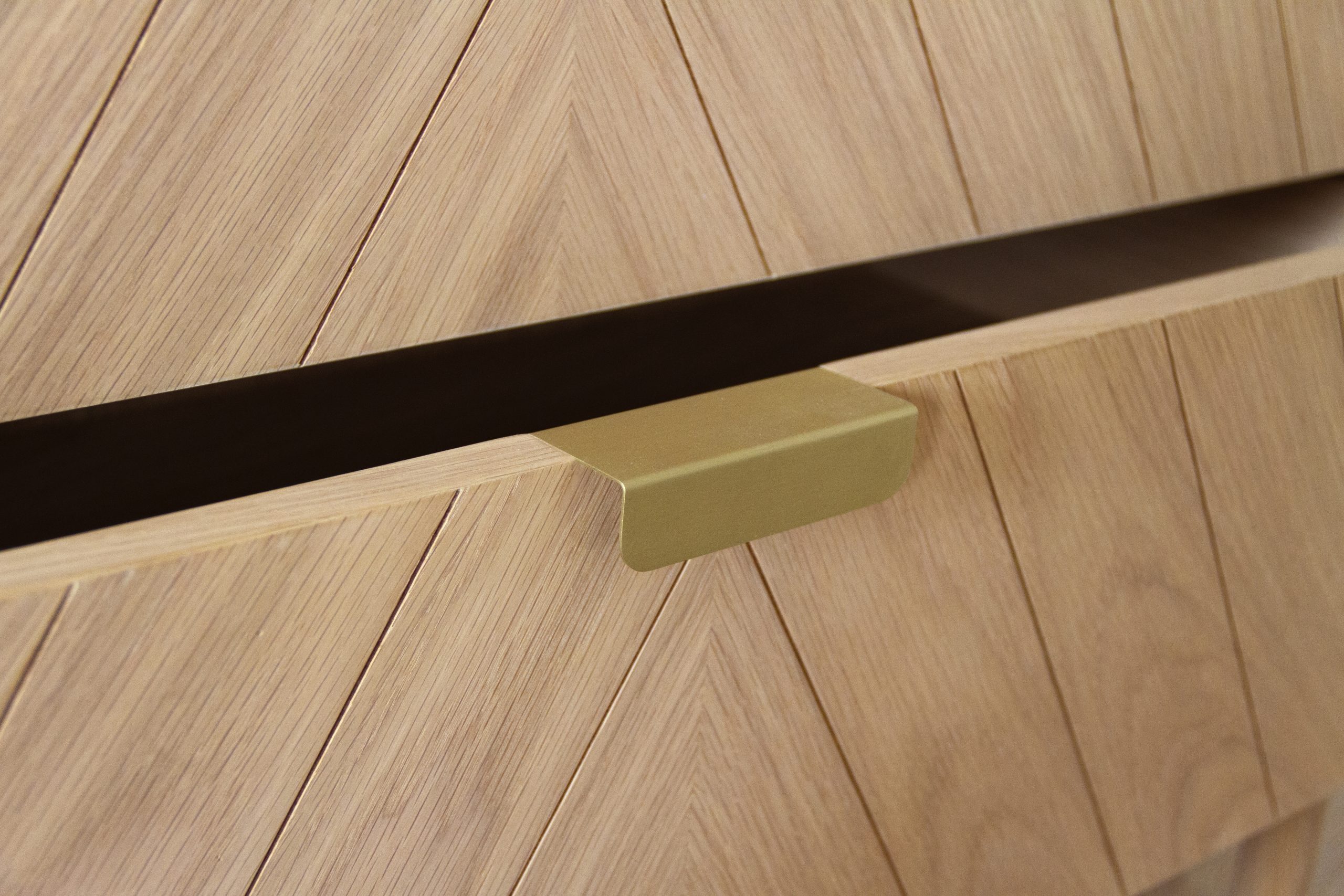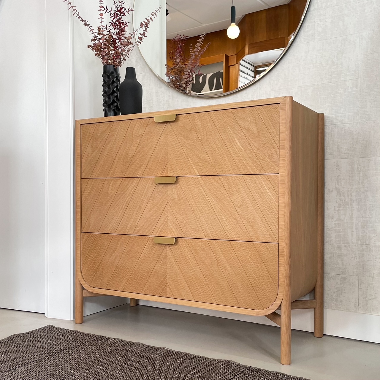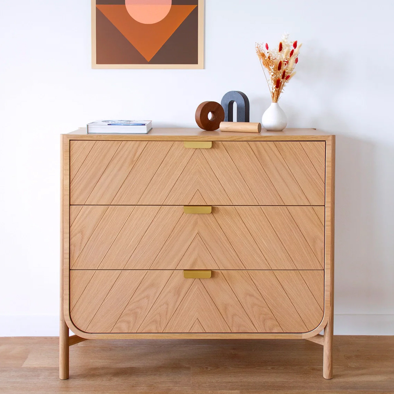 Cómoda de tres cajones Marius de roble natural, con frentes grabados en chevron y tiradores de latón.