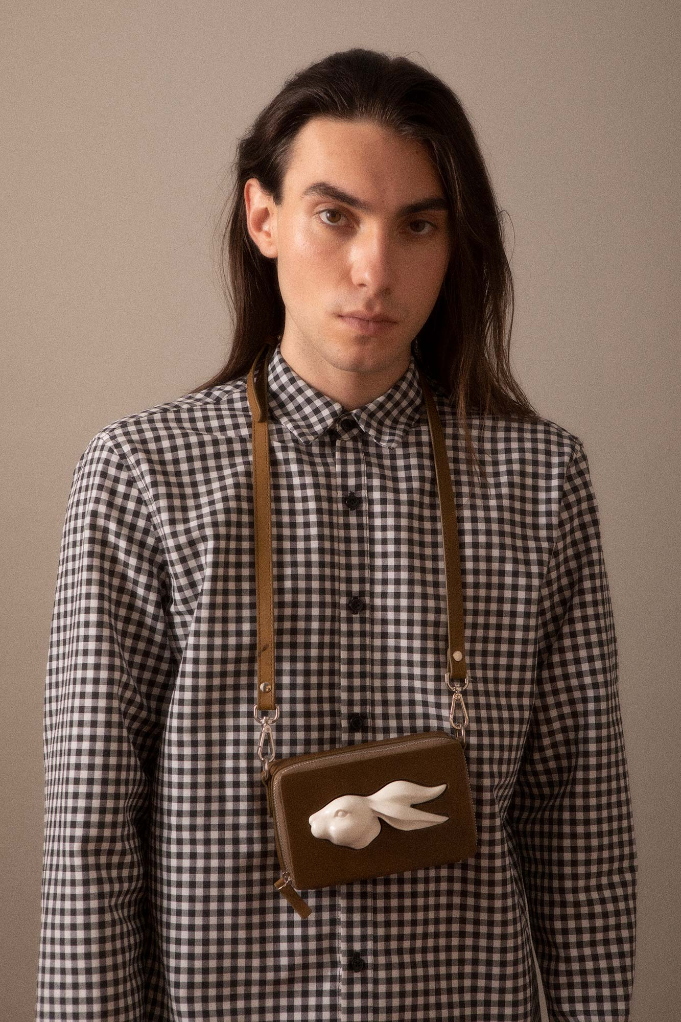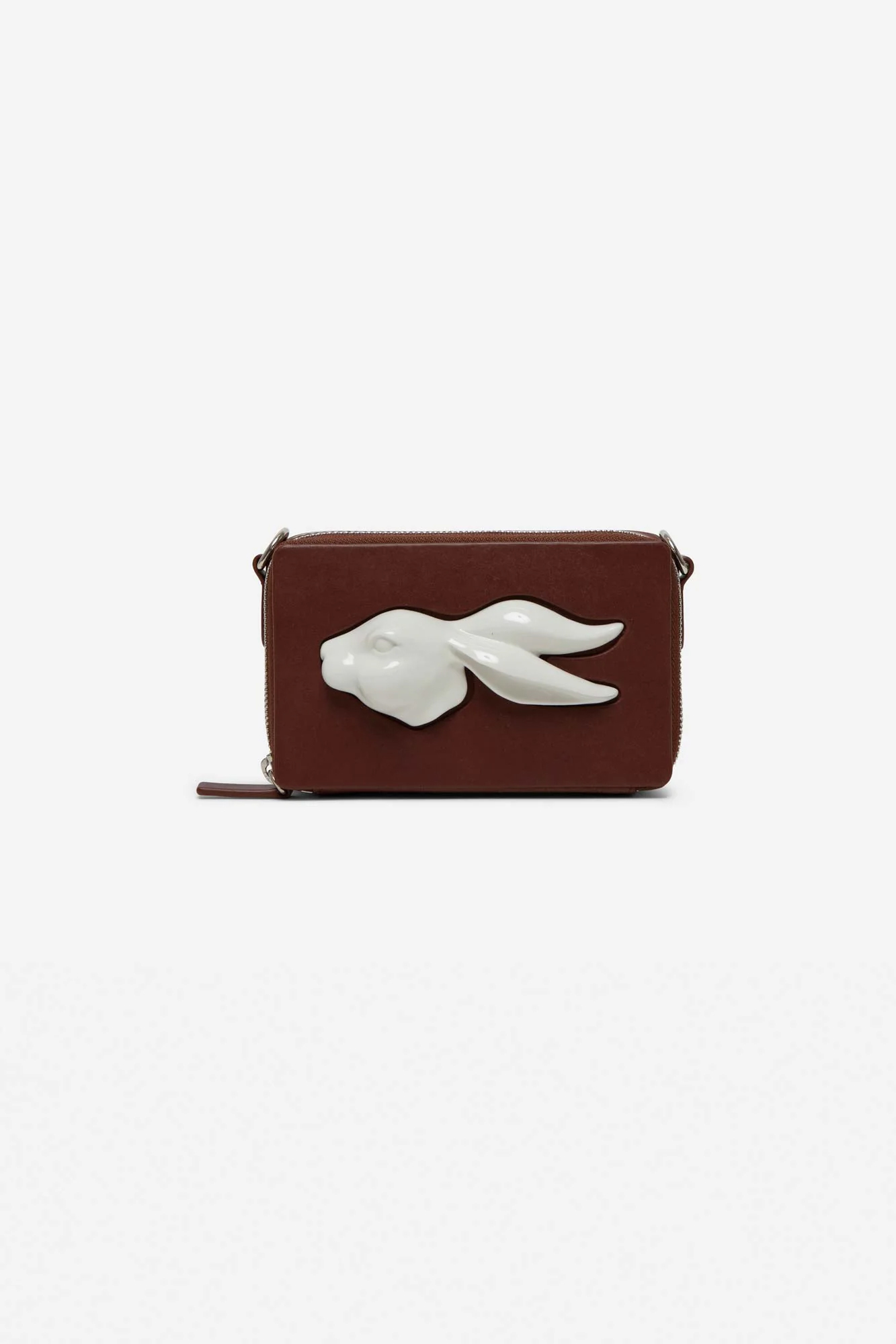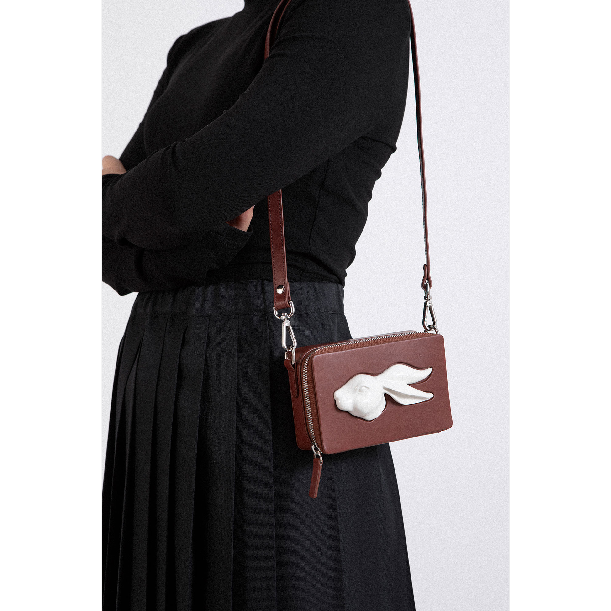 Bolso mini Rectangular Rabbit Head Cocoa de piel de becerro, con pieza de porcelana artesanal y forro de algodón.