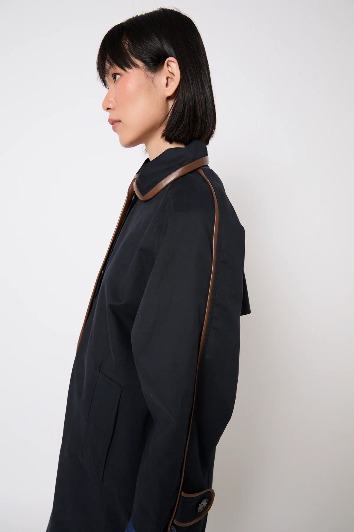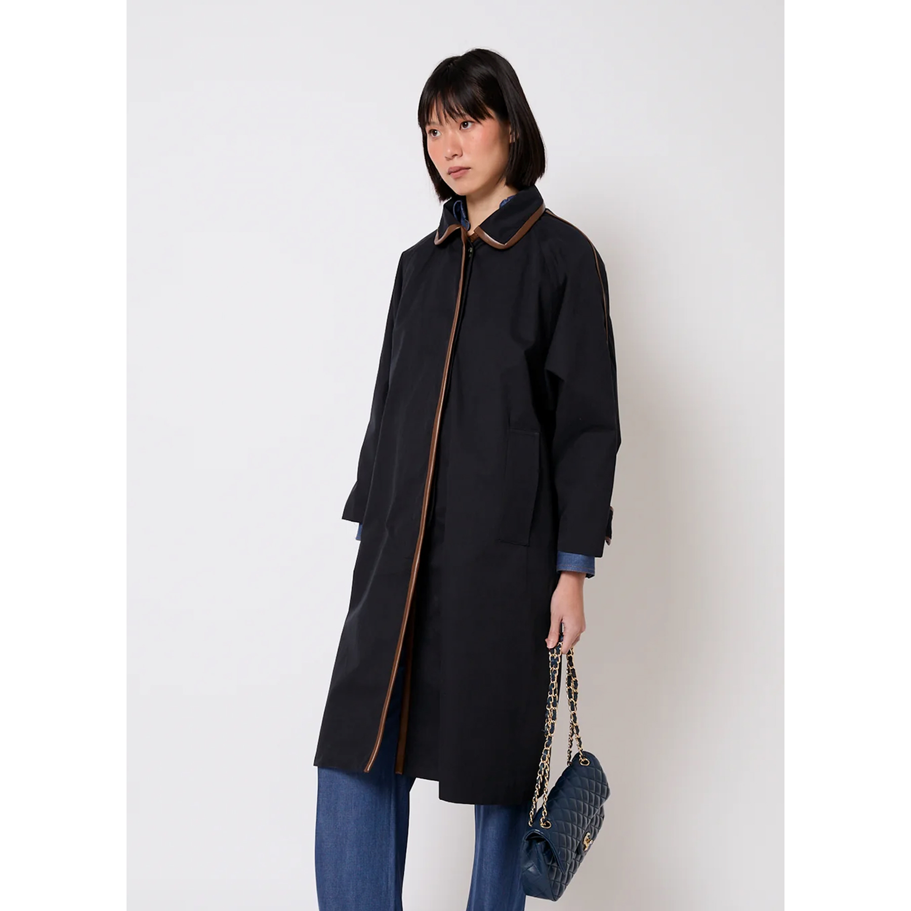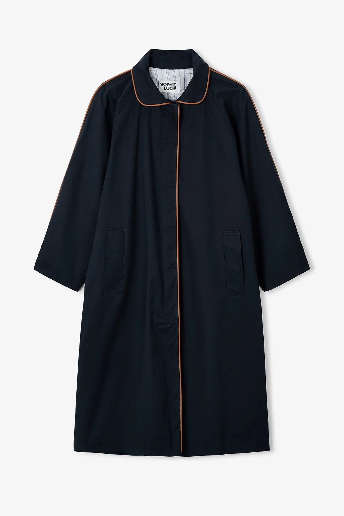 Gabardina color marino de corte recto y largo midi. Cierre frontal con botones ocultos y cuello redondeado con vivo marrón.