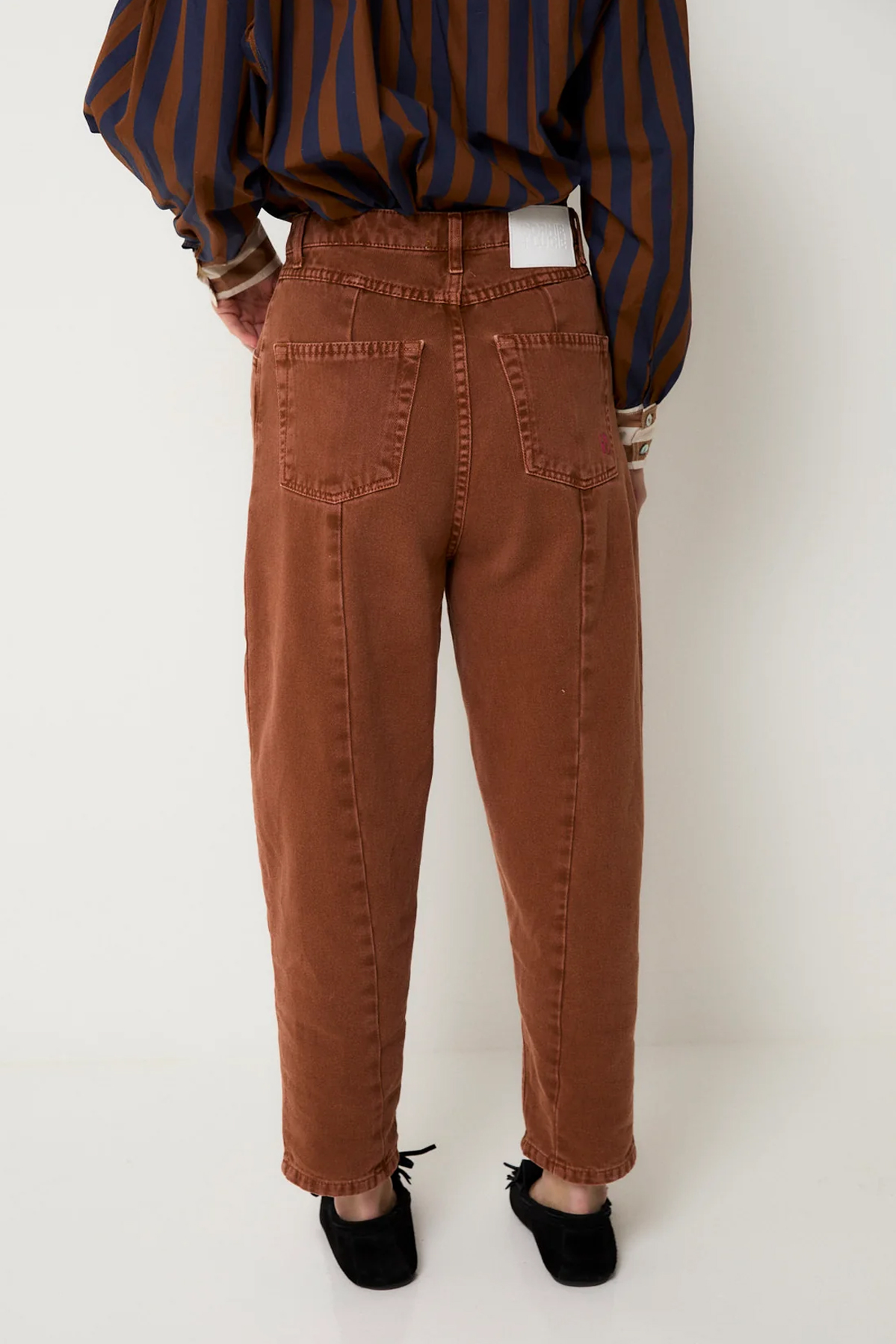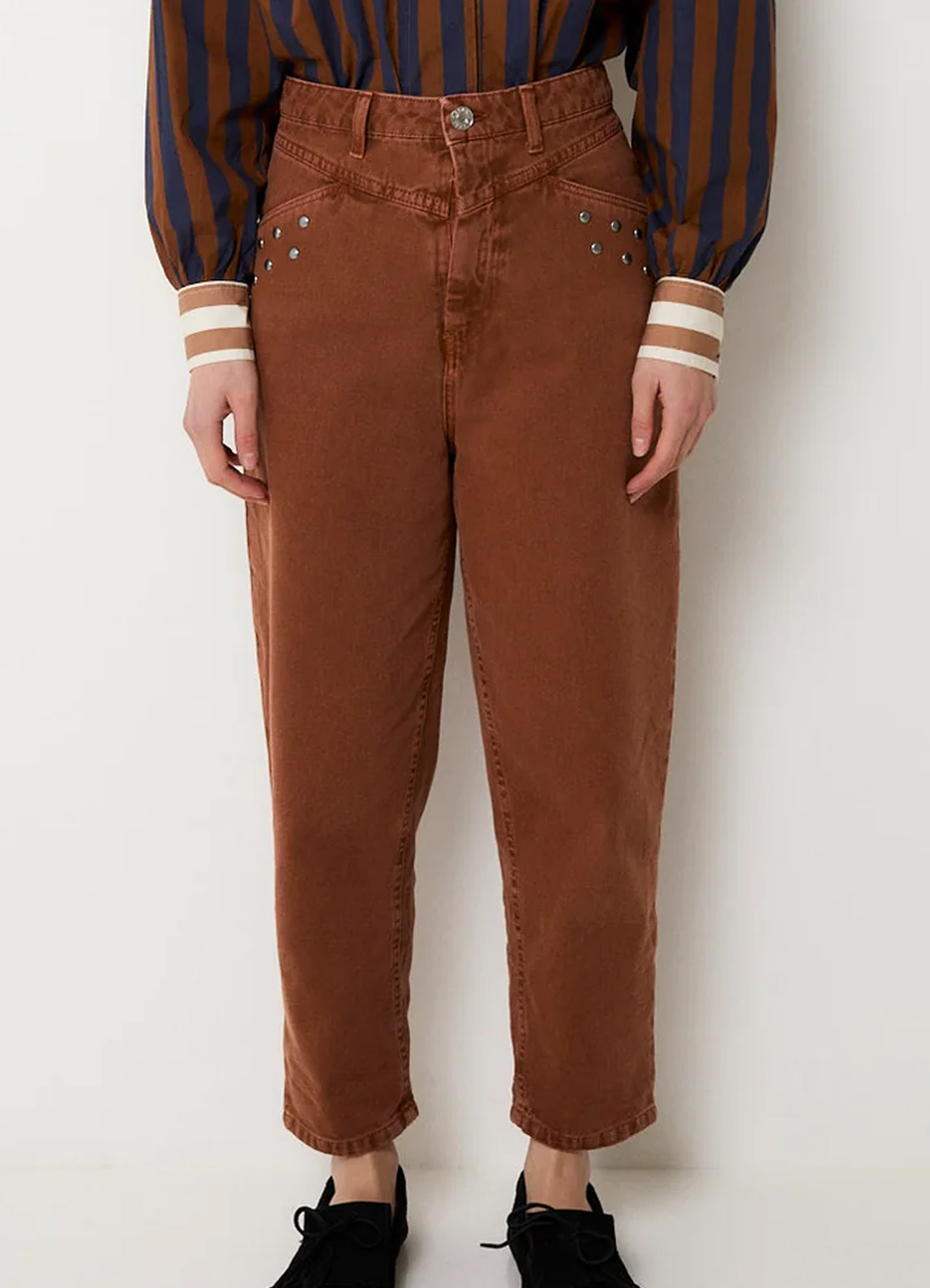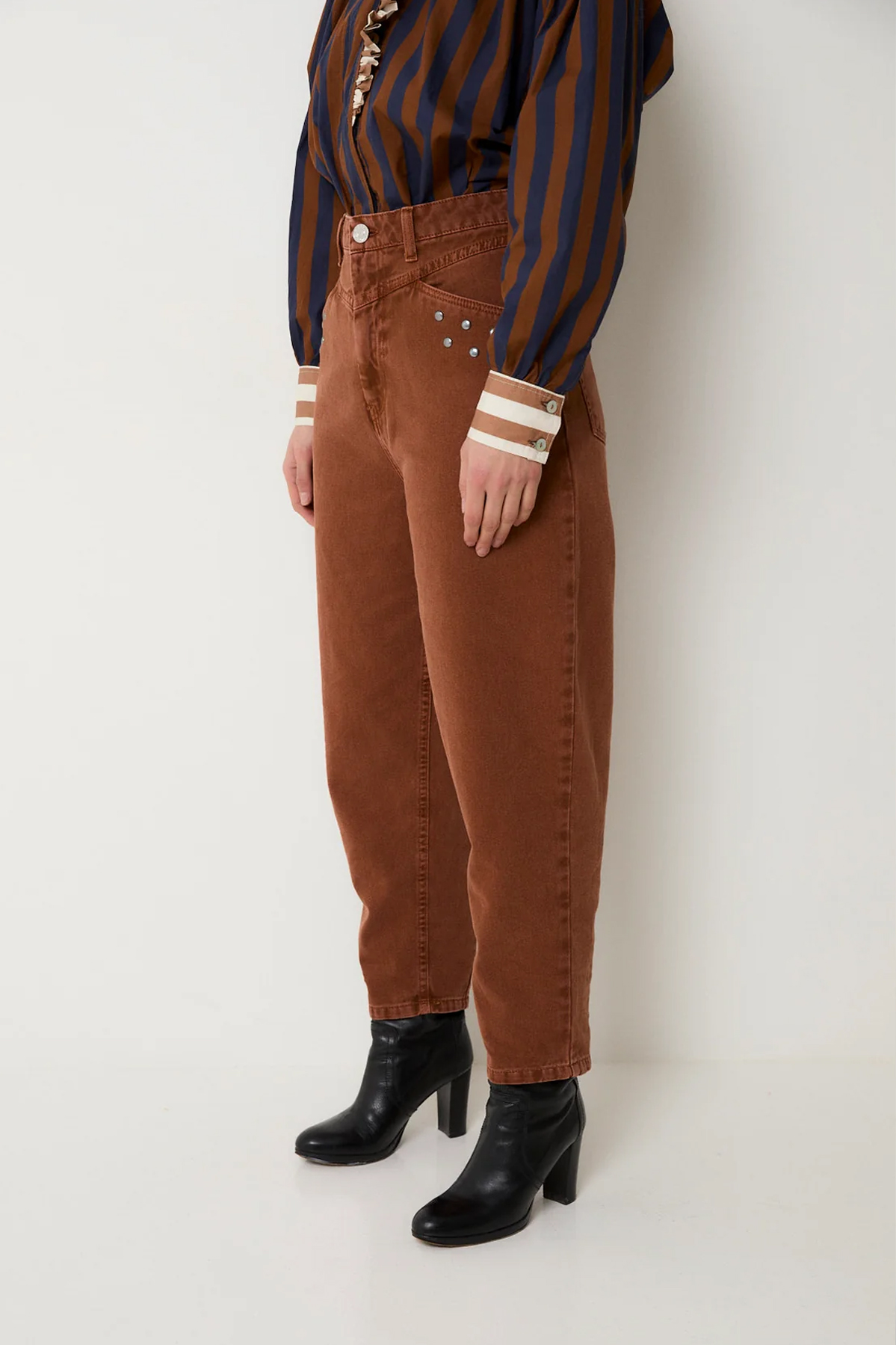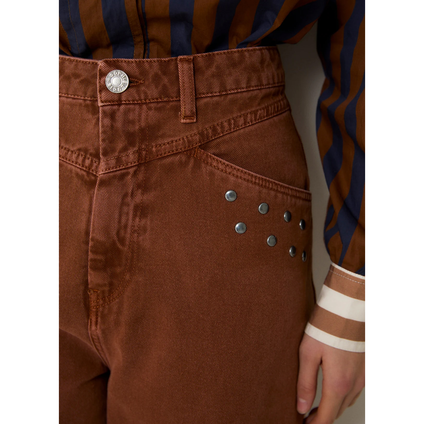 El modelo corsé, un jean confeccionado en sarga color camel con detalle de tachas en los laterales de la parte delantera, volumen en la pierna y corte trasero.
