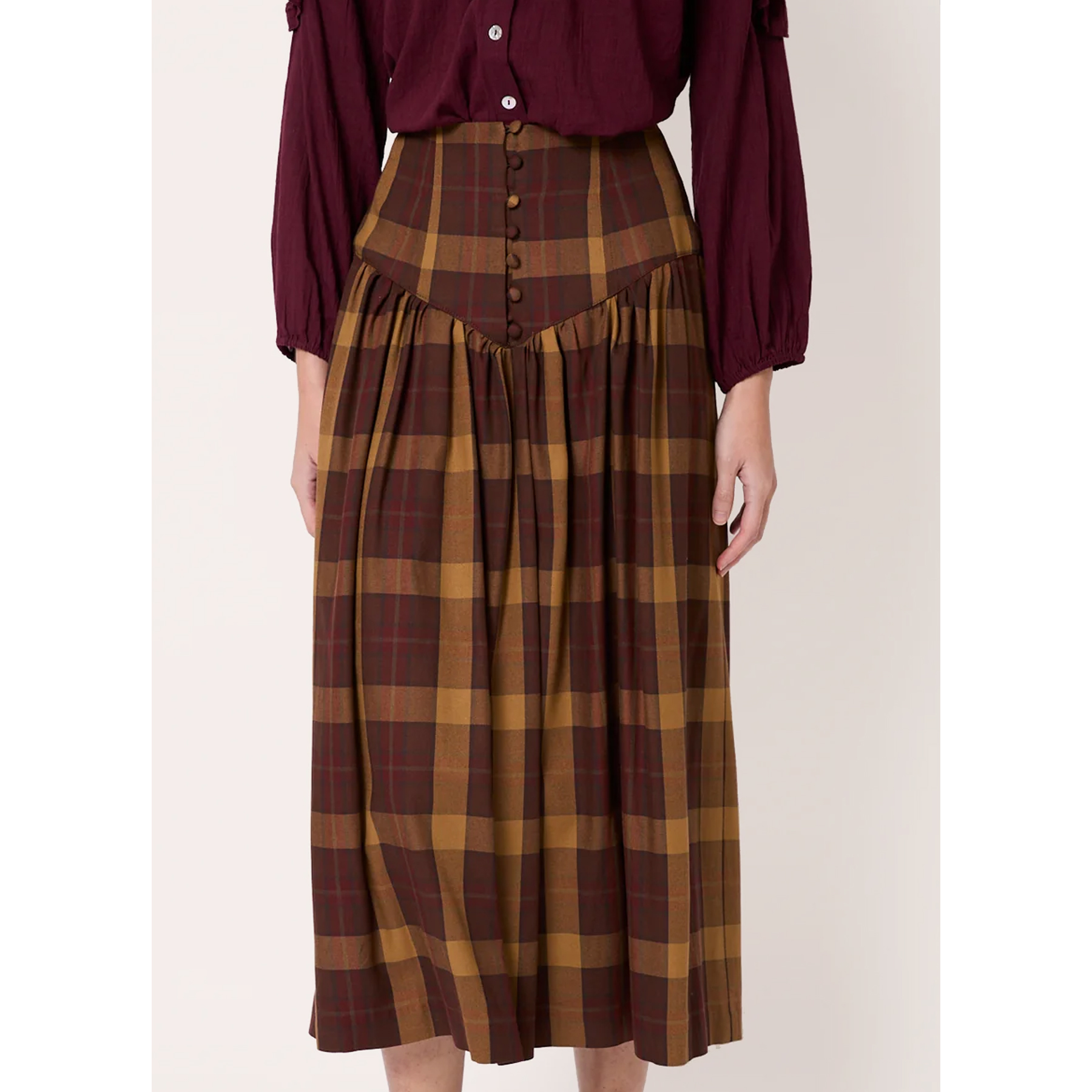 Falda midi de cuadros en tonos marrón y mostaza, con cintura alta tipo corsé y botonadura central. Cierre en el lateral con cremallera invisible.